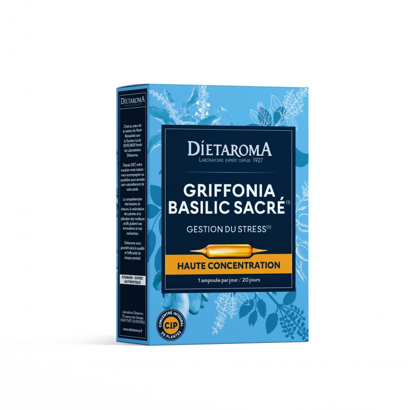 Le basilic sacré aide à maintenir la résistance au stress et le griffonia participe à l'amélioration de l'activité cérébrale.